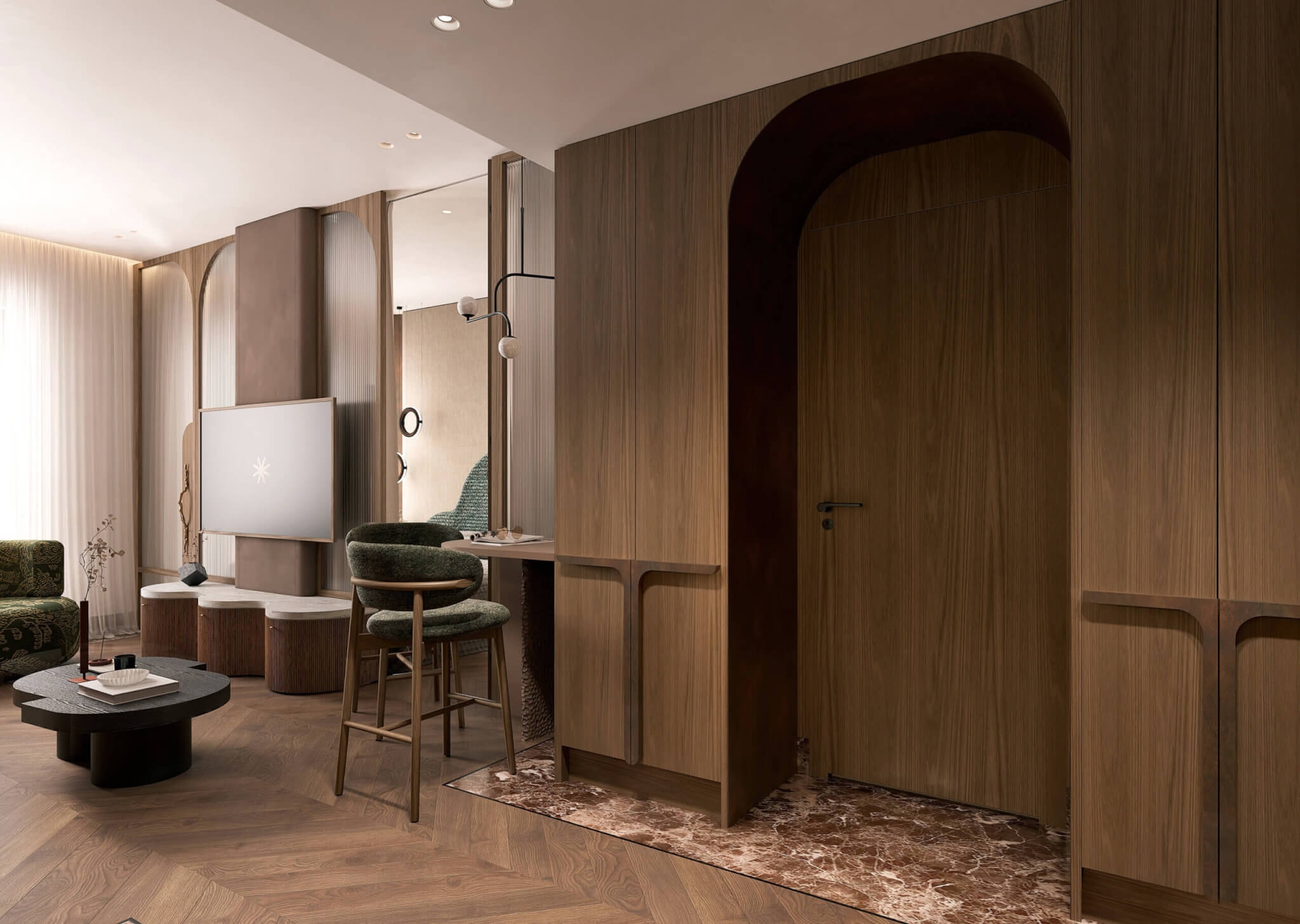 Wnętrza nawiązują do stylu modernistycznego czy art déco. Charakteryzują się harmonią proporcji, geometrycznymi detalami i wyrafinowanym rzemiosłem. Kolorystyka płynnie przechodzi od jasnych, kremowych odcieni i naturalnego dębowego drewna, które dodają przestronności i światła, do głębokich barw ciemnego orzecha, antracytu i brązu, które wprowadzają elegancki kontrast i tajemniczy nastrój. Aksamitne tkaniny, miękkie światło wpadające do wnętrza oraz starannie dobrane dodatki tworzą przestrzeń, która inspiruje i koi.
